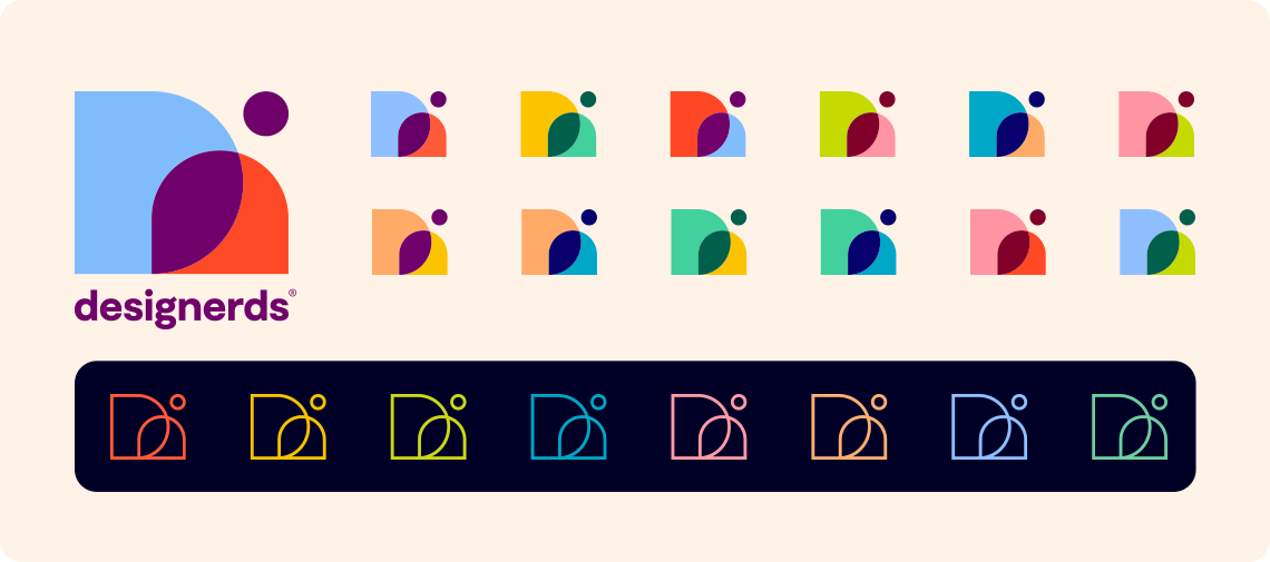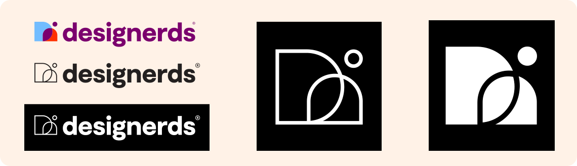 Two arched shapes intertwine to create a stable and balanced mark, while an energetic dot aligns to their point of intersection, lending movement as it leads the eye upward. The shapes that make up our logo are actually inspired by the "D” and the “n” in Designerds — they’re the same shape in two different sizes. Designerds (that’s us!) are a literal bridge between client and service. We've made the dot and the overlap the same color to visually connect the two because together, they can be interpreted as a person (with the dot being the head and the overlap the body), representing the Designerd in the middle. This humanizes our brand and makes us friendly and approachable - which we are in real life, too! Designerds are great people and the perfect complement to any brand.